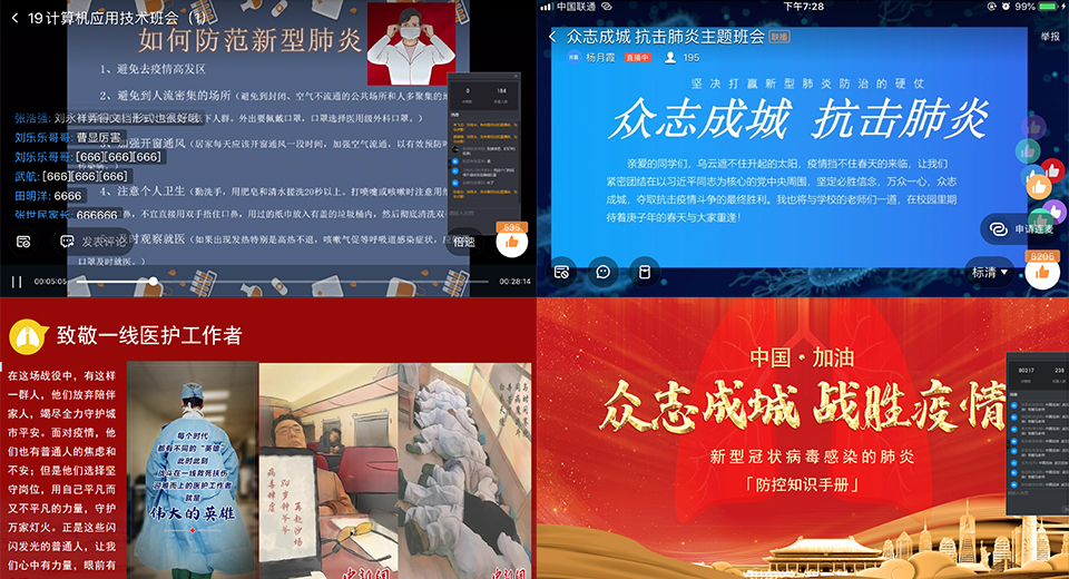 为贯彻执行公司关于员工疫情防控要求,进一步做好“停课不停学”工作,我系党总支统一部署,于2月21日-25日组织各班开展“共同战疫”网络主题班会活动。各班通过已经建立的钉钉群,以班主任辅导员直播、视频会议的形式开展活动。