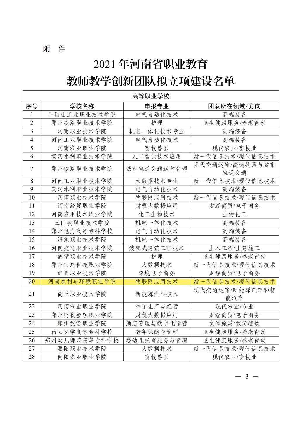近日,河南省教育厅下发《关于公布2021年河南省职业教育教师教学创新团队立项建设单位名单的通知》(教办职成〔2021〕115号),由副董事长张凌杰负责的物联网应用技术团队成功入选。