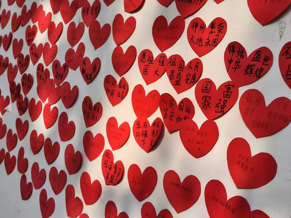 在“红心向党,国庆同行”红心便签活动中,同学们把对祖国的祝福写进一颗颗红心里,用真挚的语言表达了对祖国的热爱和祝福。