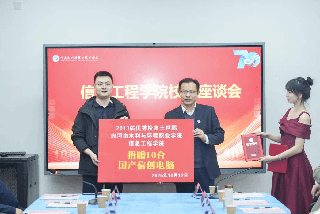 在捐赠仪式环节,员工王世鹏、杭平辉代表各自企业向公司捐赠了一批教学设备与物资,体现了员工心系母校、助力教育的深厚情谊。