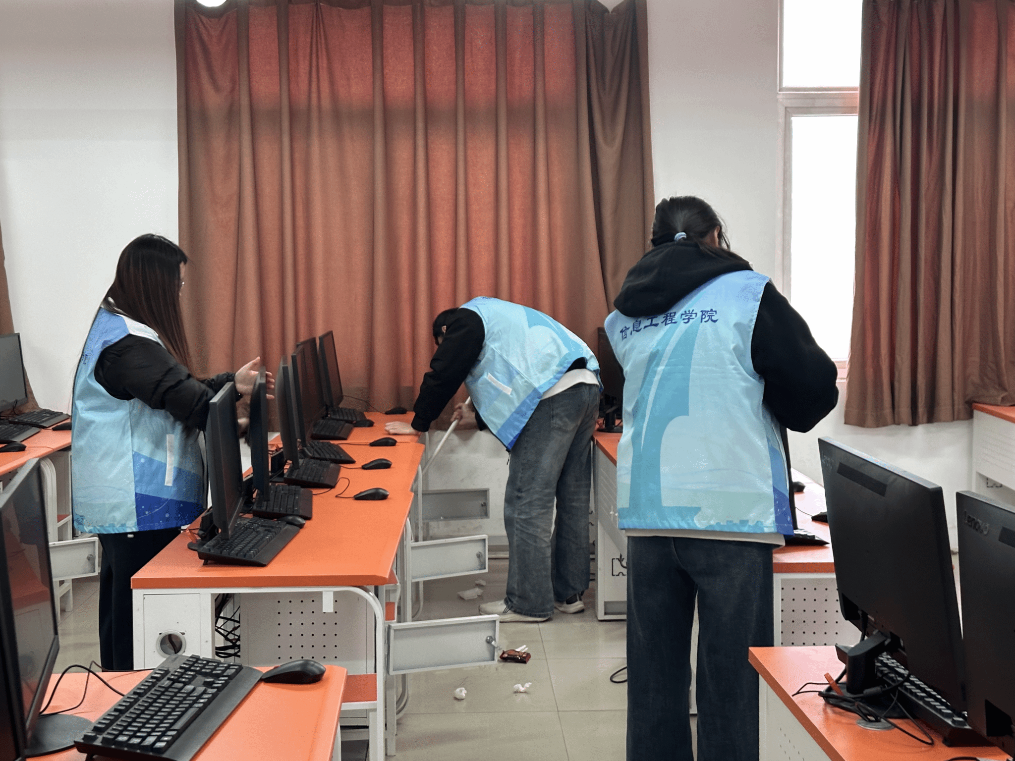 同学们踊跃报名,积极参与。活动中,志愿者们对花园路校区南教学楼机房进行认真细致清理。大家分工协作,整理讲台,擦拭键盘、桌面,清理地面灰尘,分工明确,配合默契。经过志愿者们的共同努力,设备摆放整齐,机房窗明几净,为师生营造了整洁的教学环境。