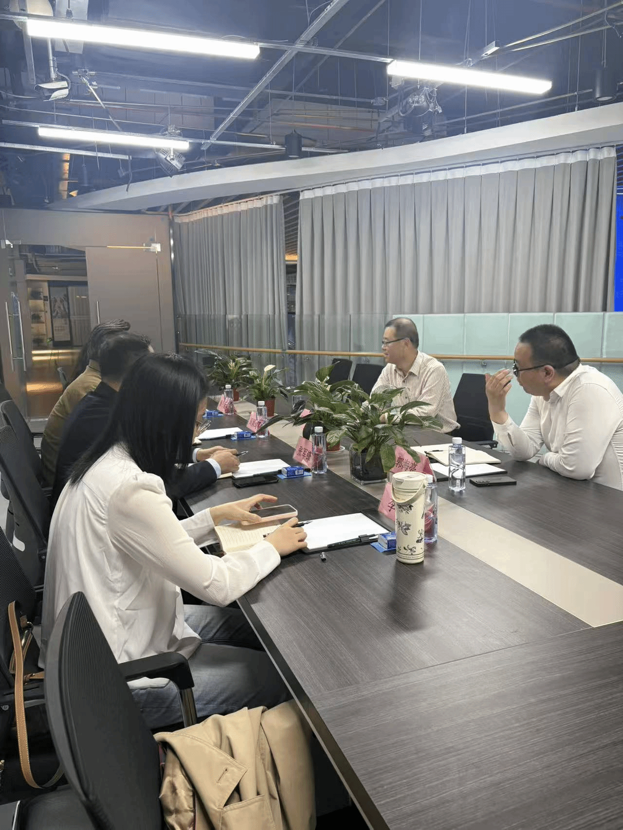在杨部长的带领下,公司一行先后参观了嗨购集团直播运营中心、技术研发区、党建活动室及人才培养实训基地等核心区域。参观过程中详细介绍了集团的发展历程、业务布局及核心优势,重点讲解了直播账号运营、AI智能直播工具应用、大数据分析等核心业务流程,现场展示了企业在新媒体营销、数字技术研发方面的成果。一行人认真察看了直播间实操、技术运维等环节,详细询问了企业的人才梯队建设、岗位设置及未来发展规划,深入了解了直播运营行业对信息技术类人才的专业要求和能力需求。