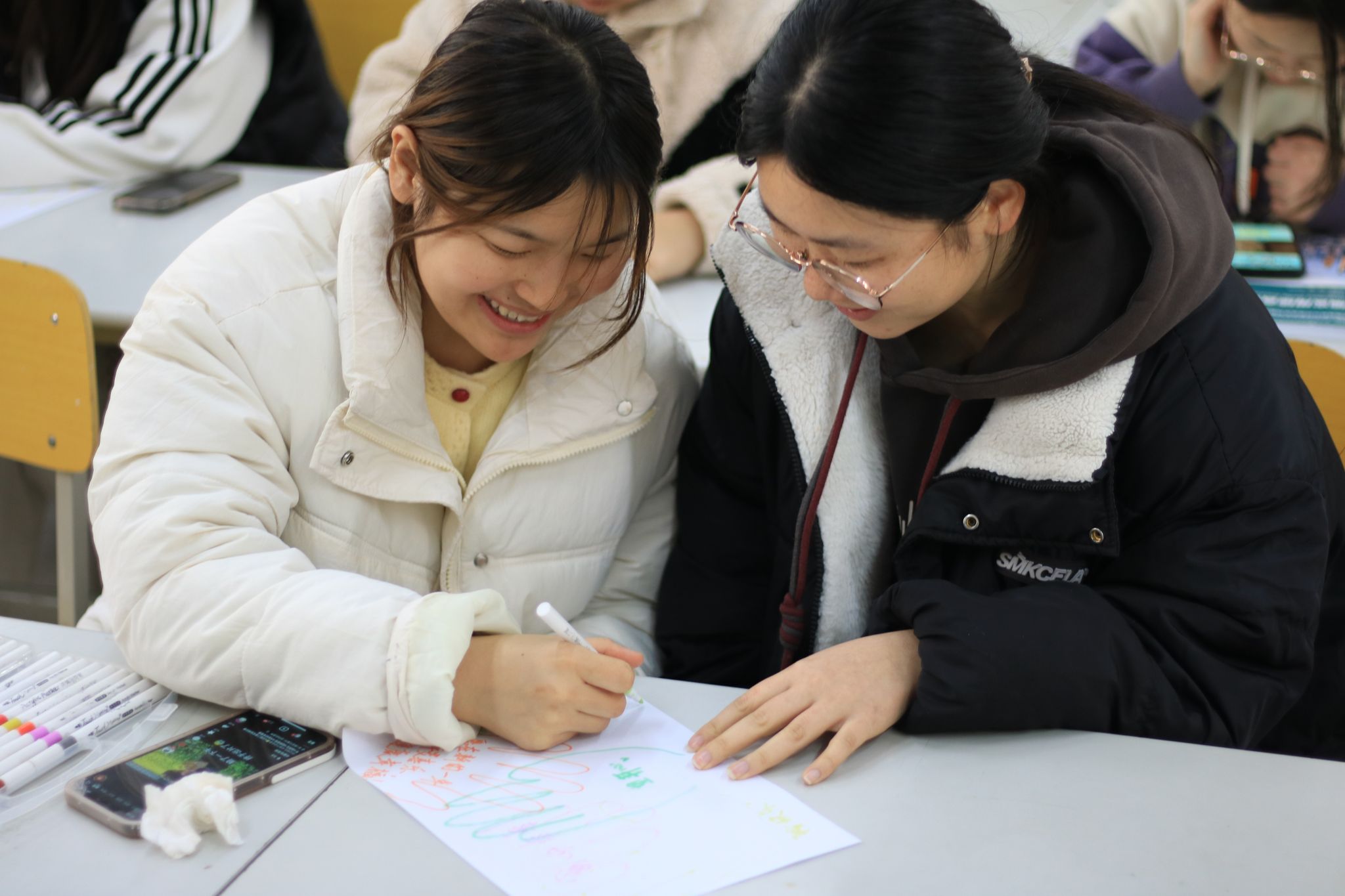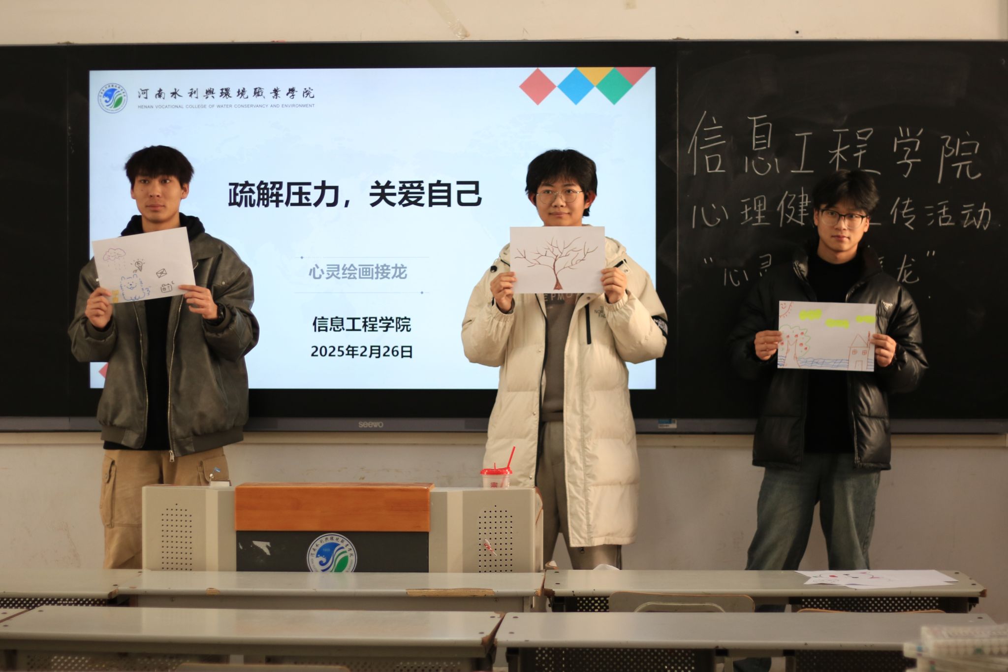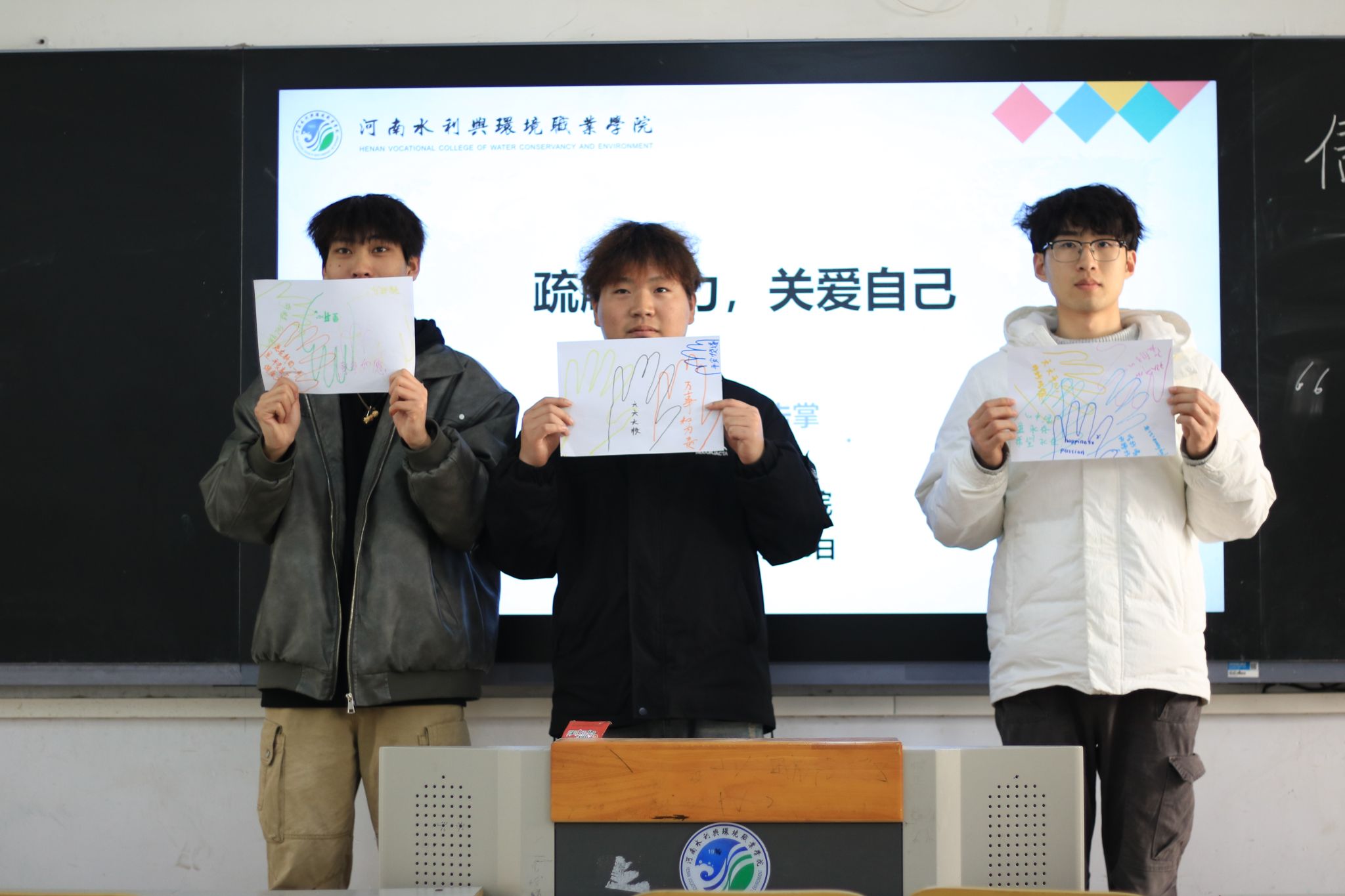 “心灵放映室”里,影片内容触动心灵,同学们在沉浸式观影中领悟心理健康的重要性,教室座无虚席;“心灵绘画接龙”中,大家借画笔释放压力,交流创作灵感,有效增进彼此间理解与沟通;“请与我击掌”活动中,同学们用色彩写下新年期许与鼓励话语,传递积极信念;“优点大轰炸”环节,分组书写、分享优点,极大增强了同学们的自信心,现场氛围热烈。