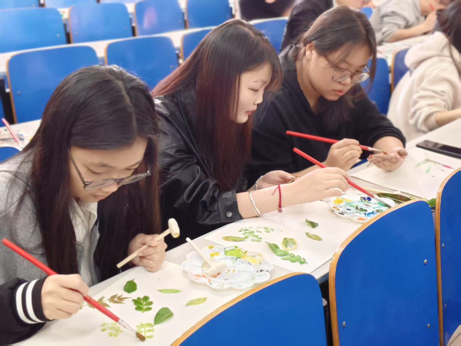 “春印自然,绿寄清明”植物拓印活动中,将传统非遗技艺与现代美育相结合,同学们将颜料均匀涂抹在植物表面,并通过精心设计、布局,将它们排列在纸张上,通过捶打拓印出独具特色的自然纹理使同学们在实践中感受传统智慧与自然之美。