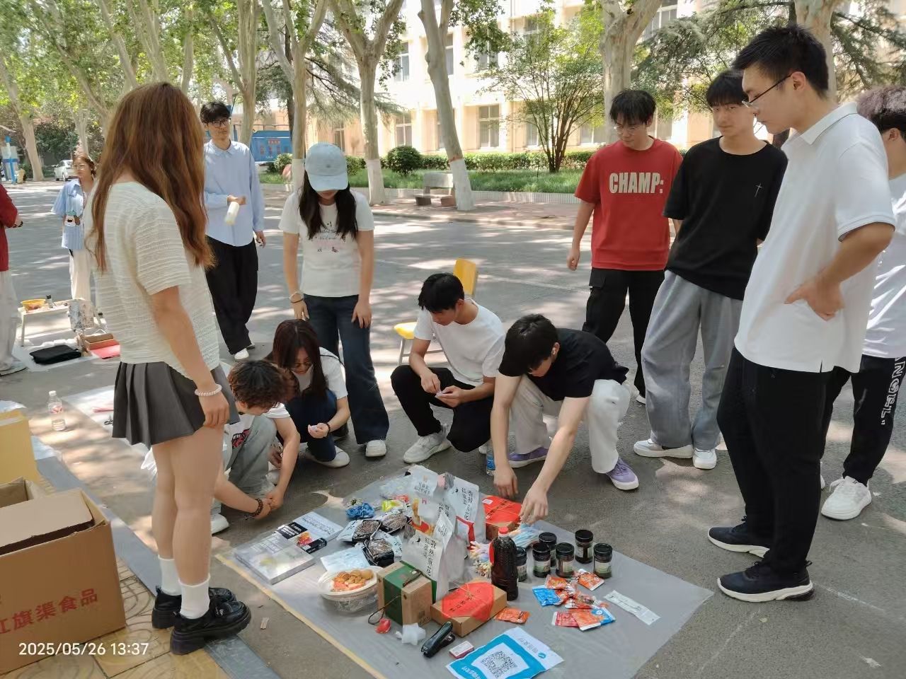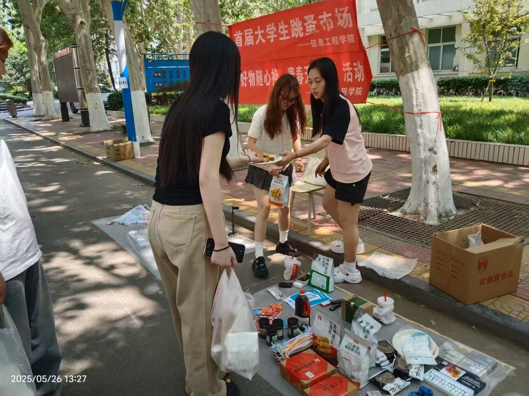活动现场,特色摊位沿林荫道依次排开,书籍刊物、学习工具、文创周边等商品琳琅满目。参与者或化身掌柜自主定价,以跳蚤市场形式实现闲置流转;或以物易物,通过旧物新缘实现交换。针对不便流通的物品,现场特设物品收集处,由志愿者统一接收、分类整理再利用