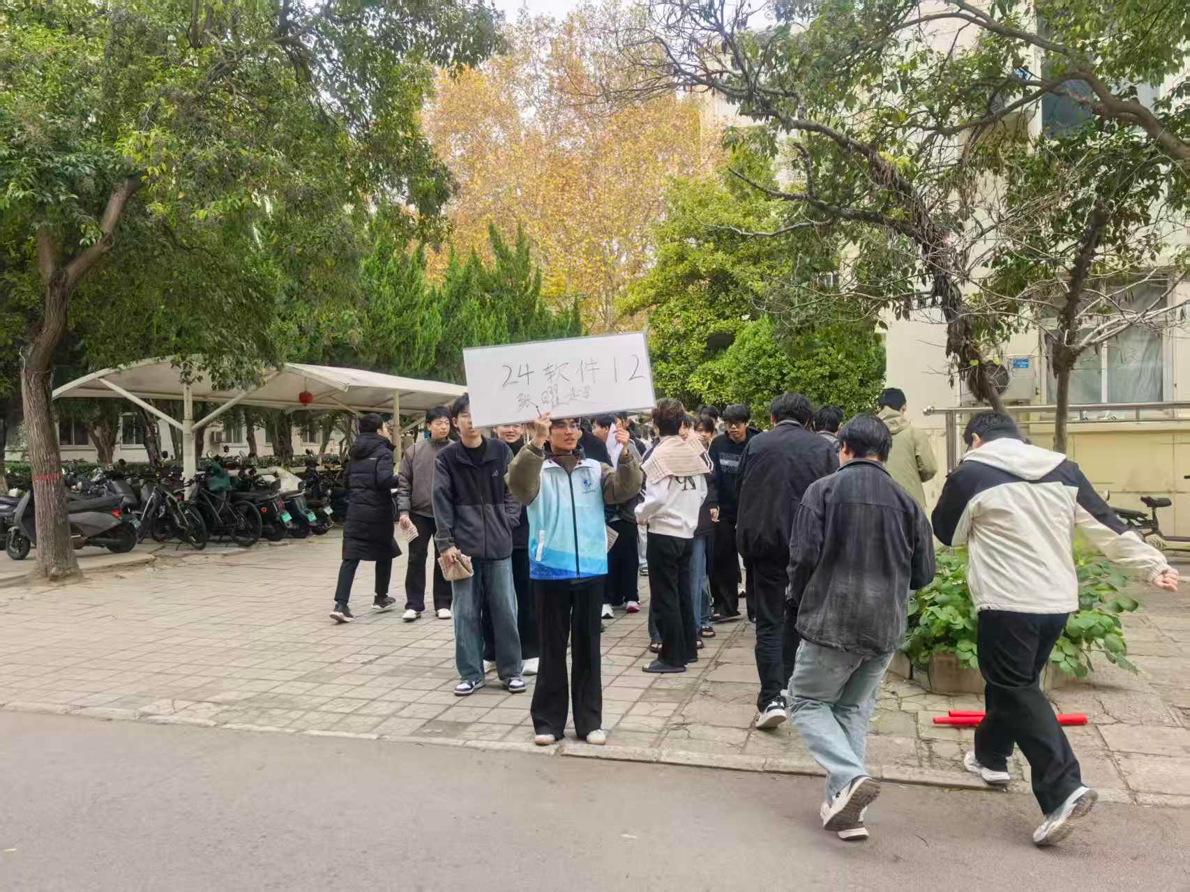 上午10时05分,男生一号公寓楼315宿舍模拟火情触发,消防警报声响起,演练正式拉开帷幕。各楼层引导员与班级干部迅速行动,在辅导员和宿管人员引导下,组织员工用湿毛巾捂住口鼻,弯腰低姿,沿既定路线快速有序撤离。疏散期间,员工相互提醒、彼此帮扶,避免拥挤;关键位置的值守引导员及时疏导人流,保障通道畅通无阻。仅2分半,全体员工便安全抵达宿舍楼前集合区域,各班级负责人迅速清点人数并上报,签到率达100%。